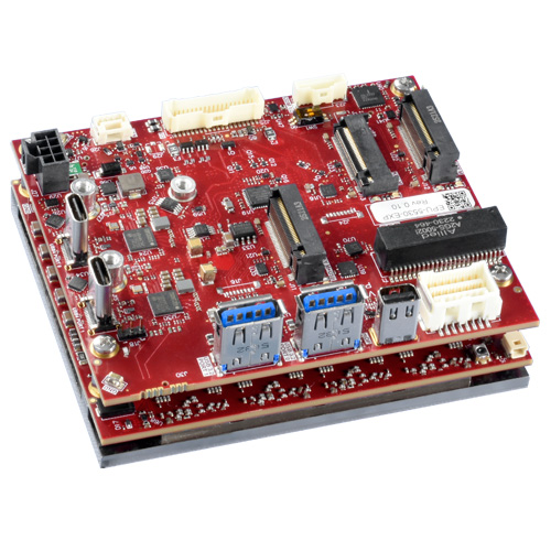 The on-board I/O includes two USB 4 Type-C, two USB 3.2 Type-A ports, and two 2.5 Gb Ethernet TSN ports. Additionally, Raptor includes two COM ports supporting RS-232, RS-422, and RS-458 standards. Three displays are supported: one mDP++ high-performance video port and two USB 4 DP Type-C ports. Three M.2 M key sockets (2x 2242, 1x 2280) support plug-in expansion.